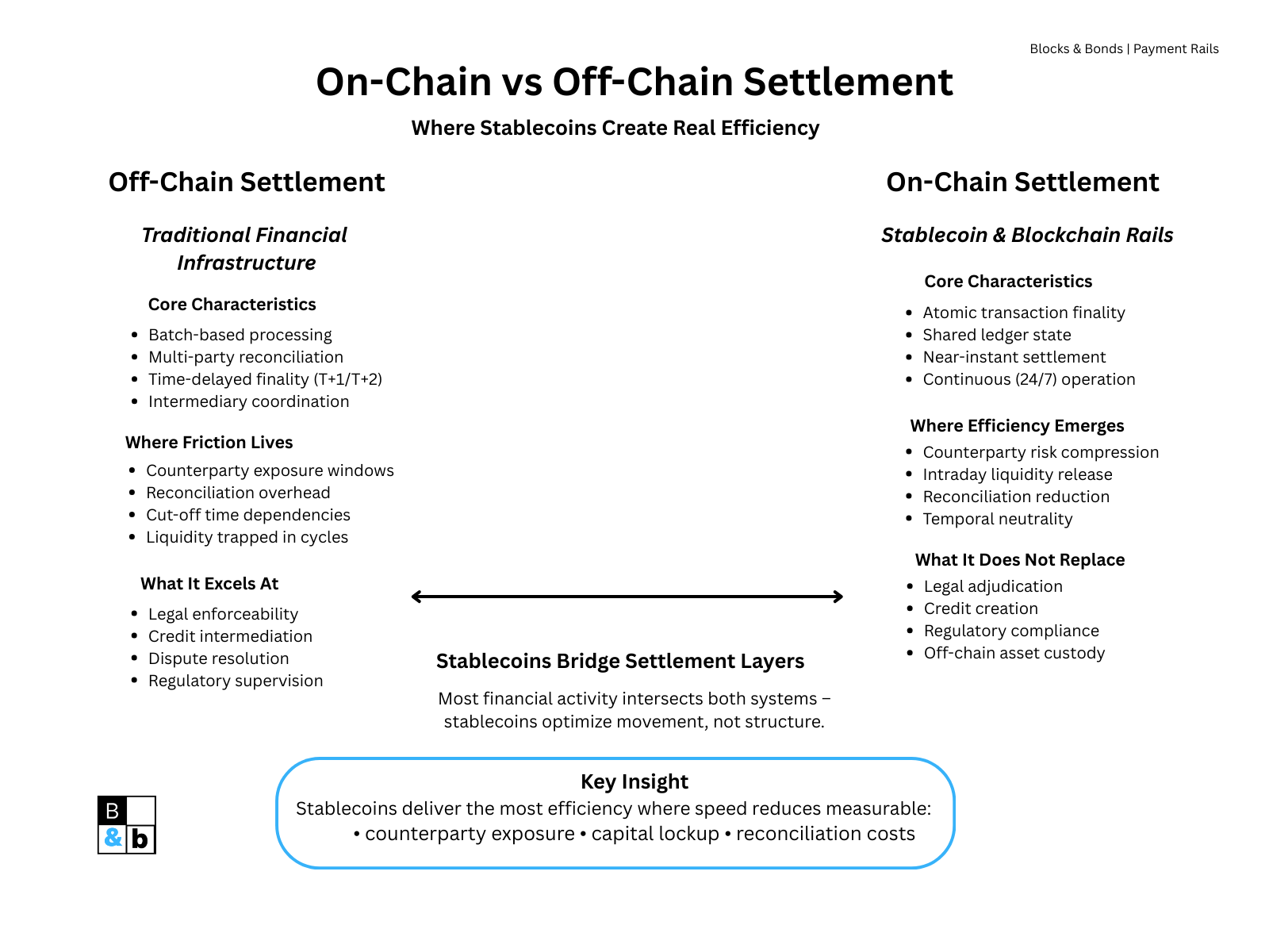 The distinction between on-chain and off-chain settlement is not a technological curiosity. It is the key to understanding where stablecoins generate durable value.