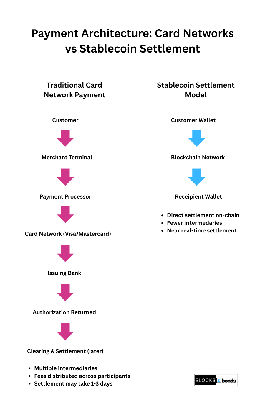 Stablecoins approach payments from a different starting point, operating on blockchain settlement infrastructure that differs from traditional financial systems. (See our analysis of on-chain vs off-chain settlement.) Instead of routing transactions through several banking and network intermediaries, stablecoin payments can occur directly between digital wallets on blockchain networks.